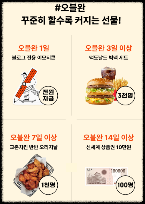 오블완 챌린지의 가장 큰 매력 중 하나는 바로 다양한 혜택이에요. 매일 참여한 만큼 다양한 보상이 주어지며, 참여 일수에 따라 받을 수 있는 보상도 다르답니다. 예를 들어, 첫날에는 현금 보상이 있을 것이고, 3일 참여 후에는 식사 세트, 7일 후에는 치킨, 14일 후에는 현금 10만원, 마지막으로 21일 후에는 스마트 TV, 스마트워치, 스마트폰 등의 경품이 기다리고 있어요.