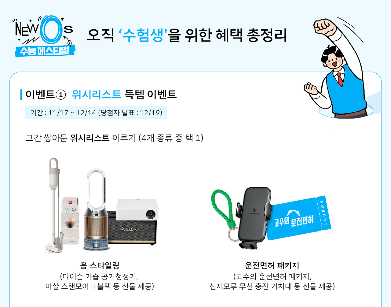 수험생을 위한 전자 기기 할인 이벤트도 열리고 있습니다. 11월 17일부터 12월 14일까지 진행되는 이 이벤트에서는 홈 공기청정기, 프로젝터, 마샬 스피커 등 다양한 제품을 할인된 가격에 구매할 수 있습니다. 당첨자 발표는 12월 19일에 이뤄지니 놓치지 마세요!
