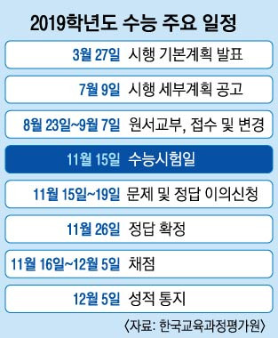 이 이미지는 2019학년도 수능 관련 주요 일정을 정리한 것입니다. 수험생들은 이러한 일정을 참고하여, 합격자 발표일과 정시 모집 기간 등을 미리 파악해 두는 것이 좋습니다.