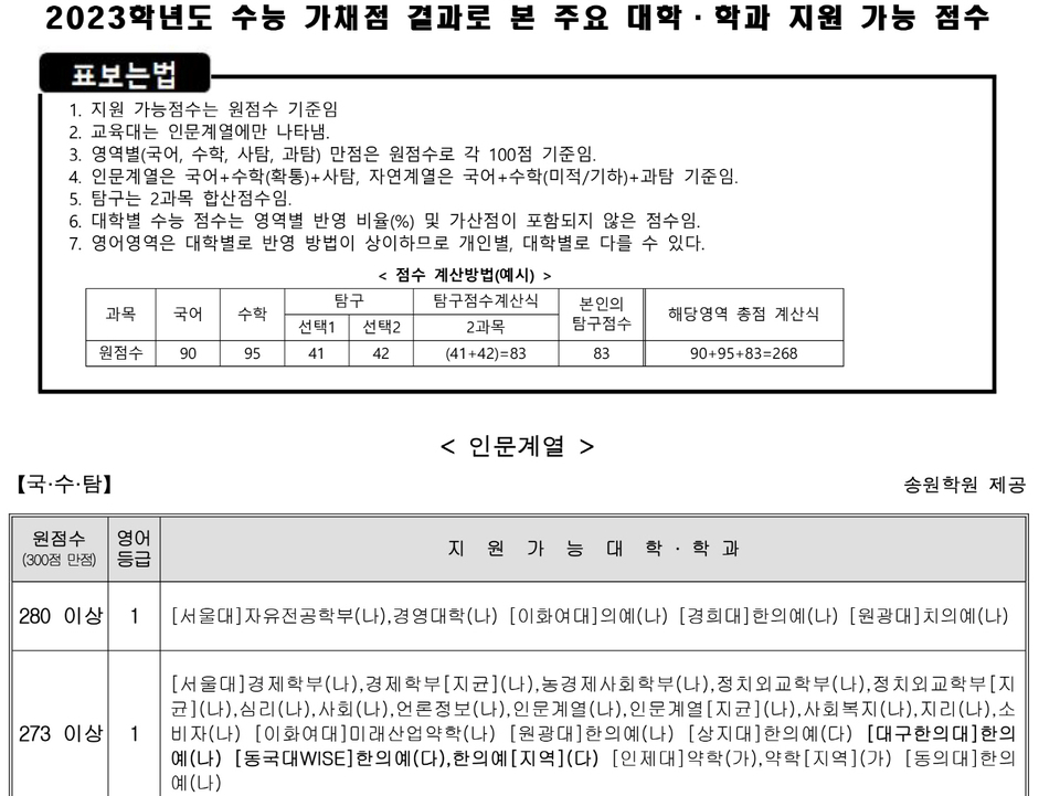 이 표는 2023 수능 가채점 결과와 대학 입학 기준을 정리한 것입니다. 각 과목의 점수와 총점 계산 방법이 포함되어 있어, 수험생들이 어떤 대학에 지원할 수 있는지에 대한 가이드를 제공합니다.