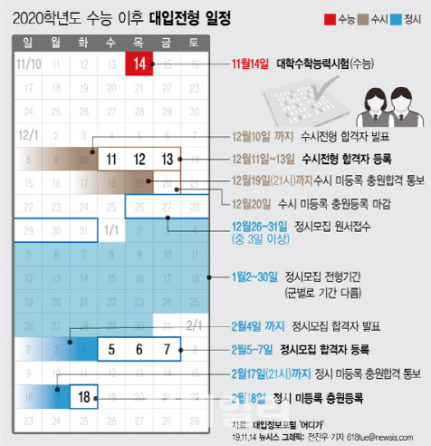 이 이미지는 2020학년도 수능 일정과 대학 입시 과정을 정리한 것입니다. 수험생들은 이러한 정보를 바탕으로 자신의 입시 전략을 세울 수 있습니다.